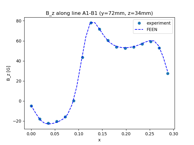 To validate the computed results, we compare them to measurements presented in [1]. The figure below shows \(\small{\mathrm{Re} (B_z)}\) (i.e. \(\small{B}_z\) at phase 0°) along a line between the aluminum plate and the coil. The dashed line represents the results calculated by FEEN, the bullets represent the measurement results. The close match between the two confirms FEEN’s accuracy.